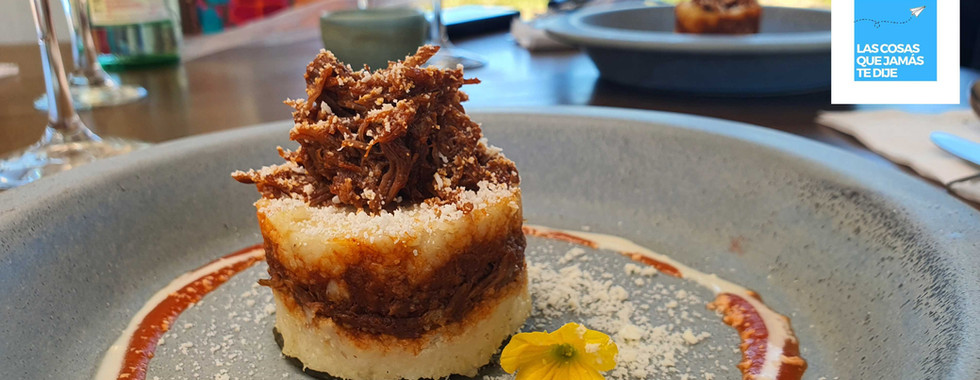 En la cocina michoacana, el pastel de Uchepo es un tamal de maíz tierno y tintes dulzones, la chef Vázquez se apropia de la receta colocando capas del mismo sobre suaves pedazos de costilla marinada de cerdo y finas tiras de chile tatemado. El toque de color se revela ante la crema de rancho, salsa de tomatillo y queso cotija.